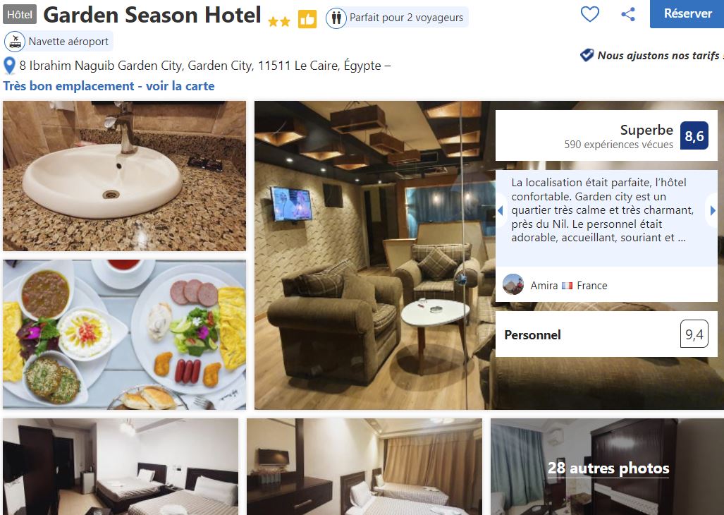Ou même le le Garden Season Hotel, un très bon rapport qualité/prix et à deux pas de la place Tahrir, dans le quartier sympathique de Garden City et à deux pas du Musée égyptien du Caire, donc idéalement placé!