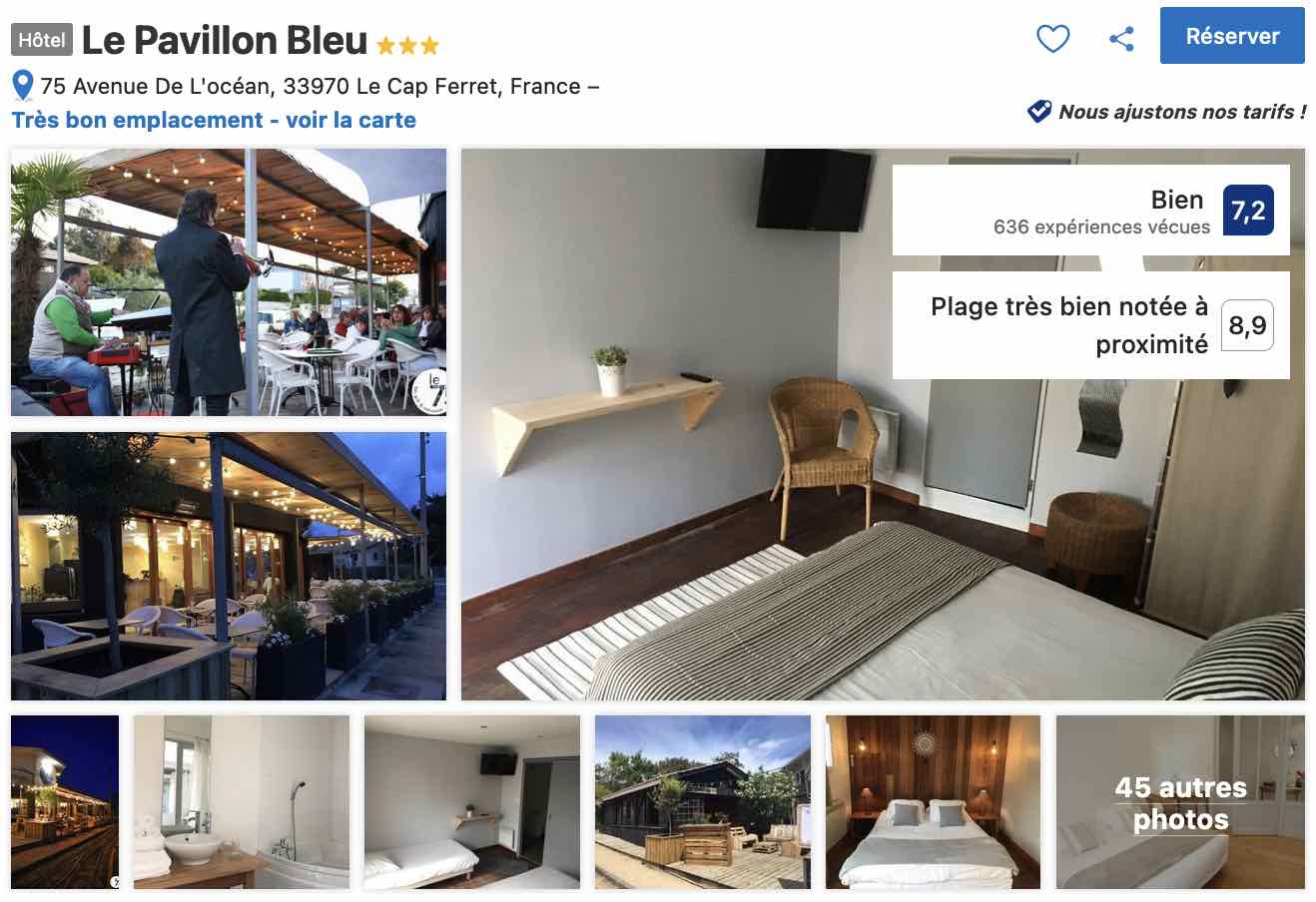 Pour un tarif relativement abordable au début de l’été, je vous recommande en premier lieu de poser vos valises à l’hôtel Le Pavillon Bleu. Il se situe en léger retrait du centre, mais à seulement une cinquantaine de mètres des dunes du Cap Ferret pour rejoindre les plages de l’océan Atlantique.