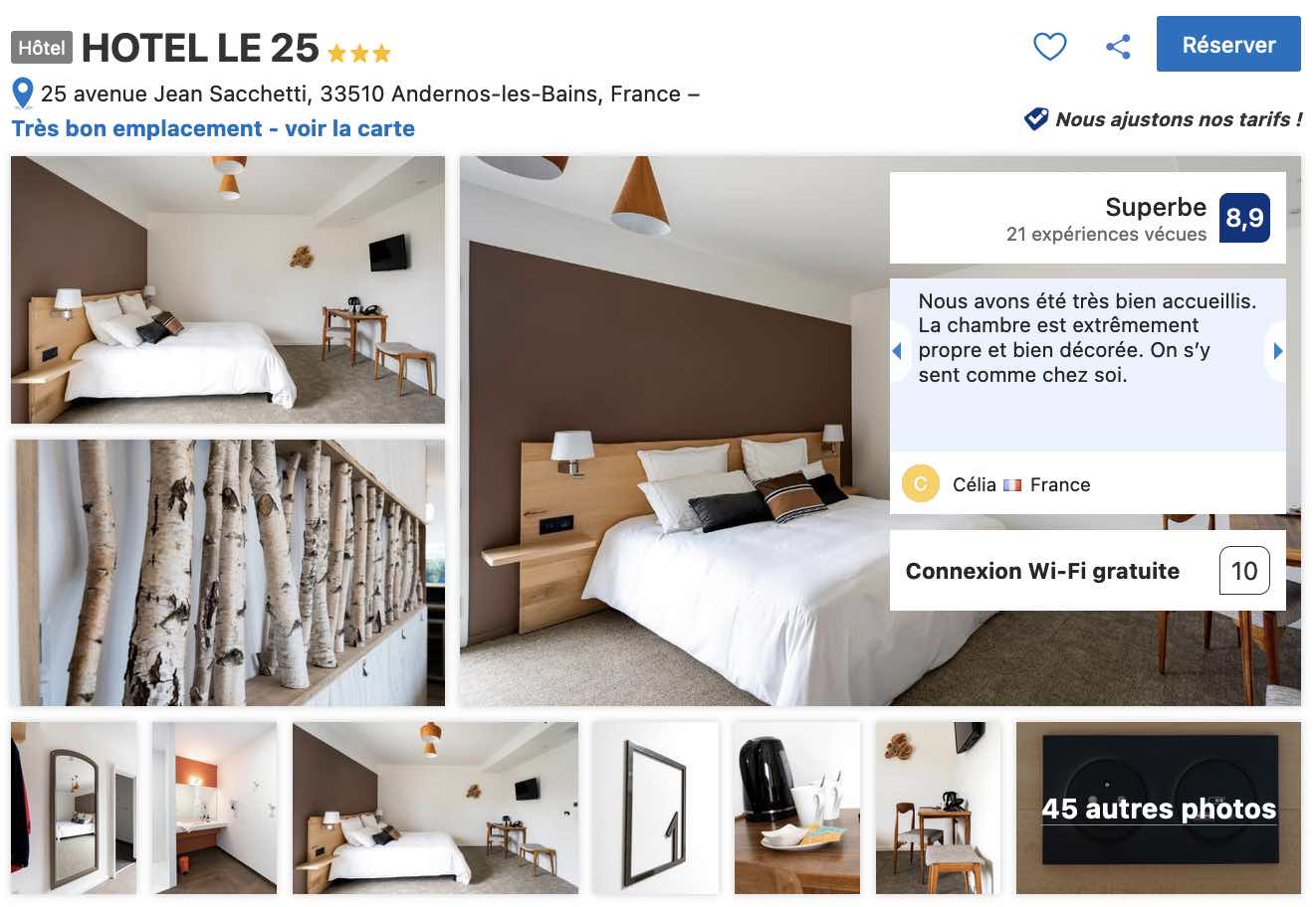Autre adresse pour un confort qualité / prix similaire, l’Hôtel le 25 qui vous permet de loger au centre d’Andernos Les Bains et de rester à une distance appréciable du Cap Ferret.