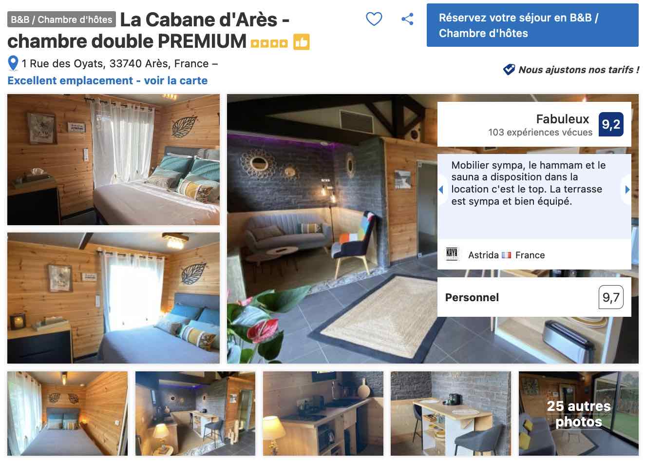 Un peu plus cher, mais pour un hébergement atypique près du Cap Ferret, je vous invite à réserver votre chambre à La Cabane d’Arès. Un Bed & Breakfast qui fait l’unanimité auprès des voyageurs ayant laissé leur avis en ligne pour le confort et l’environnement de l’établissement.