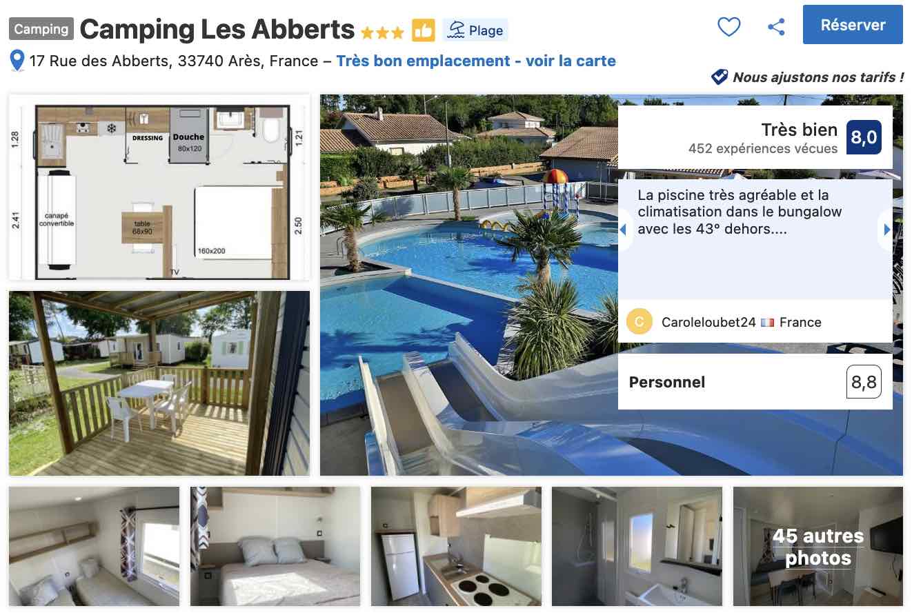 Si vous aimez le camping à un tarif très abordable, vous pouvez dormir dans une chambre en bungalow au camping Les Abberts à Arès. Pensez à réserver suffisamment tôt !