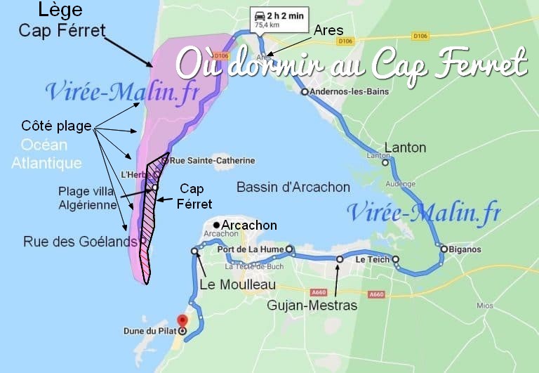 Comme vous pouvez voir, le Cap Ferret n’est qu’une partie du Lège Cap Ferret et donc du Bassin d’Arcachon, si vous ne trouvez pas un hôtel/logement intéressant au Cap Ferret je vous conseille de lire mon article « où dormir à Arcachon« .