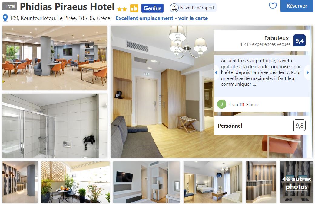 Si vous arrivez assez tôt au Pirée et que vous voulez profiter de votre soirée pour aller au restaurant, boire un verre, vous balader dans le vieux port Mikrolimano ou Marina Zeas alors jetez un œil à l’hôtel Phidias Piraeus Hotel, c’est est une bonne adresse qui se trouve au port Marina Zeas (voir partie 3 de cet article) et qui propose des navettes gratuites pour rejoindre l'embarcadère.