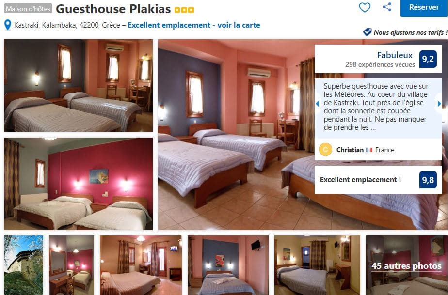 Pour ma part comme je vous l’ai dit en début d’article j’ai logé à l’hôtel Plakias (à Kastraki) et franchement je vous conseille grandement de jeter un oeil aux avis car c’est vraiment une très bonne adresse avec un très bon rapport qualité/prix. Notre chambre avait vu sur les Météores… Si il n’y a plus de places cherchez un hôtel proche de celui-ci !