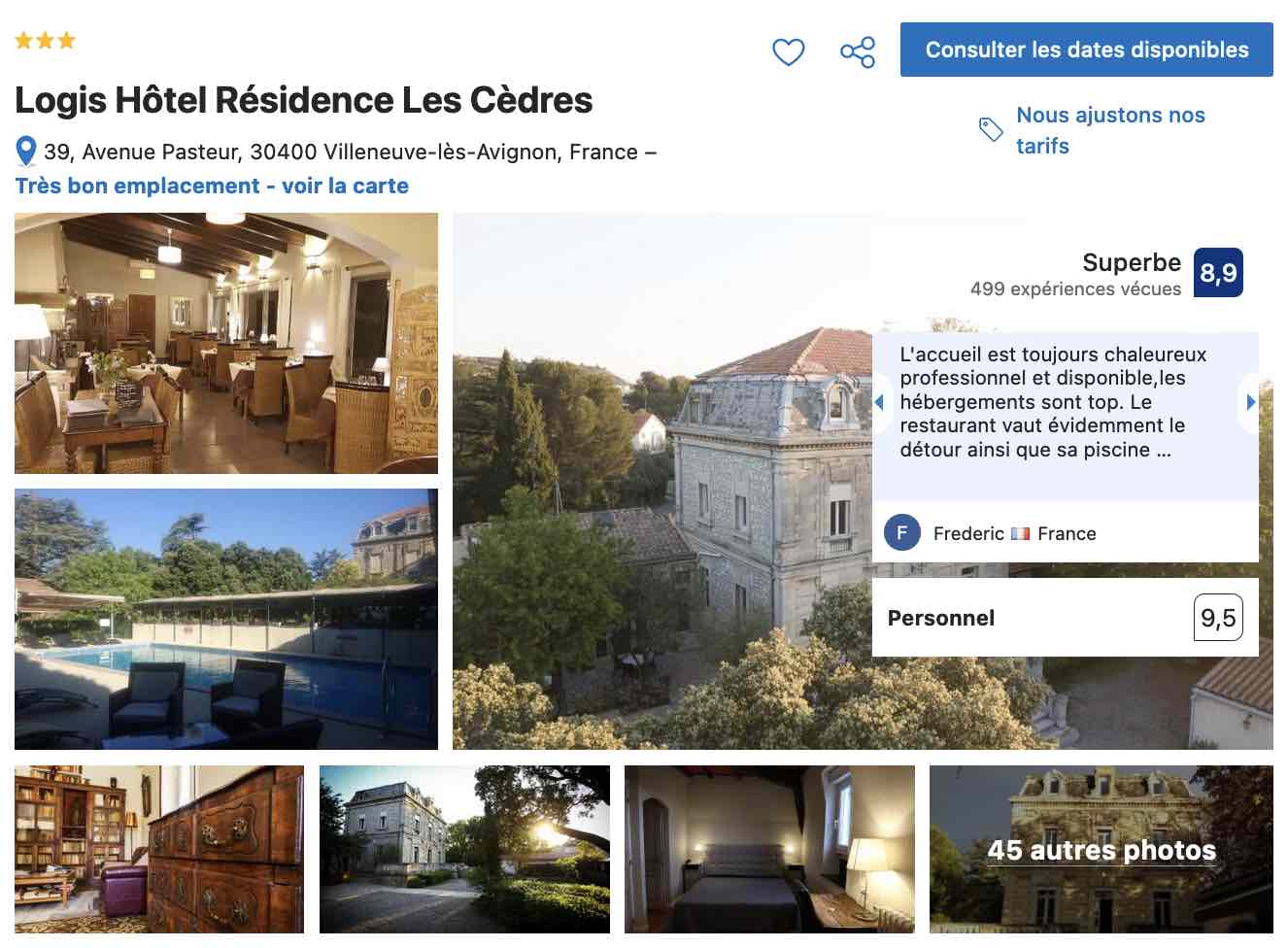 Un peu plus éloigné, mais dans la même gamme de prestations et de prix, vous avez aussi l’hôtel Résidence Les Cèdres qui vous donne l’opportunité de dormir au calme, dans le cadre reposant d’un parc fleuri où s’épanouissent des arbres centenaires, d’où le nom de l’hôtel. Il vous faudra une voiture car vous êtes quand même à 10 min du centre en voiture soit 40 minutes à pied.