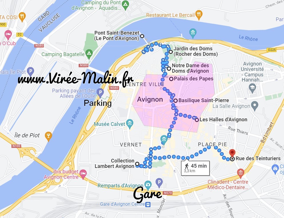 Sur cette carte que j’ai personnalisé pour vous, on peut voir les sites incontournables à visiter à Avignon mais surtout la zone (en violet) que je vous conseille pour trouver votre logement, vous serez idéalement placé pour profiter de la ville à pied mais aussi pour sortir le soir, c’est ça aussi le voyage!