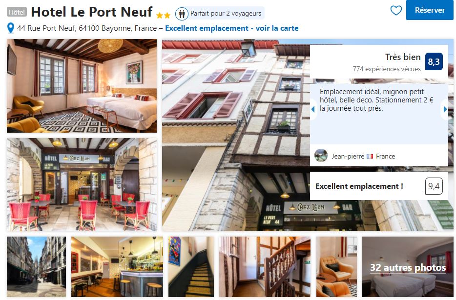 L’hôtel le Port Neuf se trouve en plein coeur du Vieux Bayonne. C’est une belle adresse qui vous permettra de loger dans une authentique batisse historique Bayonnaise. Vous avez un parking à 2€ la journée à deux pas de l’hôtel, pratique !