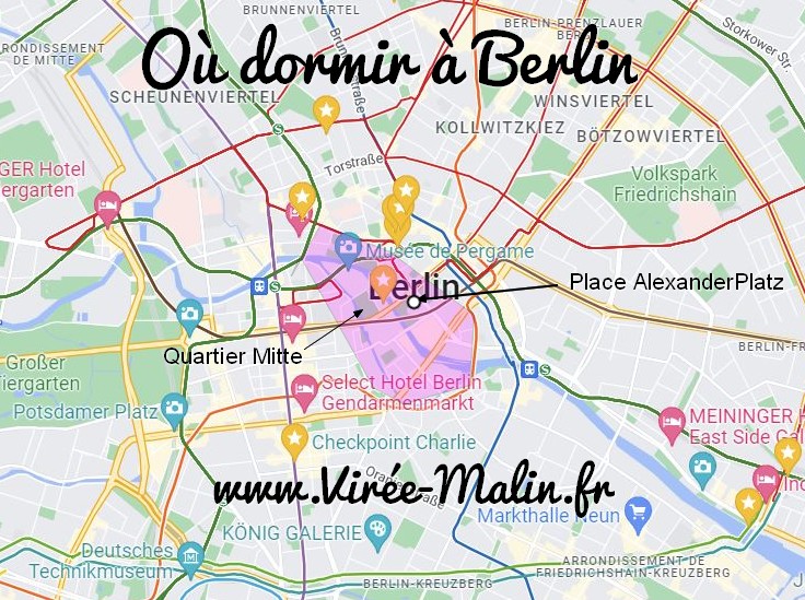 Pour ceux qui me font déjà confiance, c’est dans la zone violette que je vous conseille de loger à Berlin, c’est le quartier Mitte, là où se trouve les musées principaux, là ou part les bateaux sur le fleuve Spree. Vous serez idéalement placé, à deux pas de la place AlexaderPlatz et comme vous pouvez le voir vous êtes au croisement de nombreuses lignes de métro vous permettant de vous rendre facilement à n’importe quel point de la ville, bref c’est l’idéal!