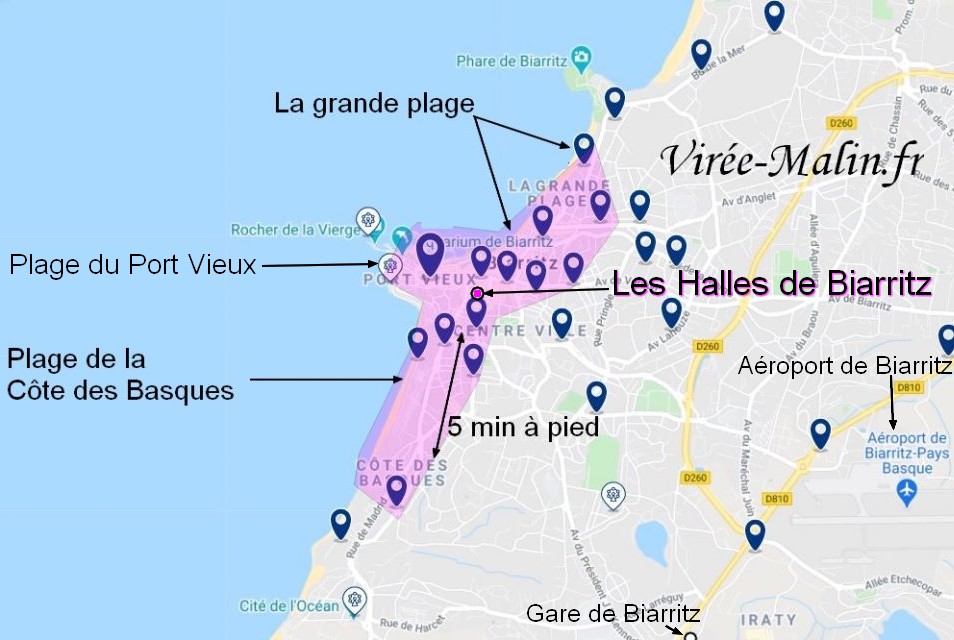 - Cliquez ici agrandir cette hôtelMap – Où loger à Biarritz et choisissez un hôtel qui se trouve dans la zone violette ci-dessous (autour des Halles de Biarritz):