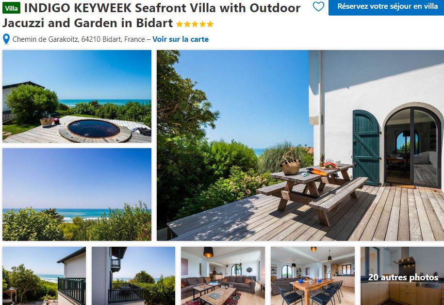 Une incroyable adresse, il s’agit d’une maison avec vue sur la mer, c’est la villa Bidart Jaccuzi, je vous laisse regarder les photos c’est complètement dingue !! Par contre, il vous faudra une voiture ou un vélo pour rejoindre Biarritz, ça fait un peu loin à pied…