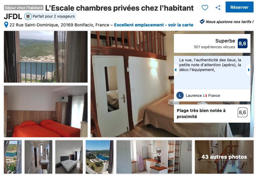 Attention, je préfère vous prévenir, le tarif des hébergements dans l’hyper centre de la ville historique Bonifacienne est relativement élevé, surtout si vous décidez de voyager en pleine période de vacances estivales. Pour un prix un peu plus abordable, je vous conseille de cibler certains hébergements sur et autour du port de plaisance. Vous serez à distance de marche correcte de la porte de Gênes, du Cimetière marin, du Chapeau de Napoléon, du jardin des Vestiges et du Bastion de l’Étendard (lien Googlemap).