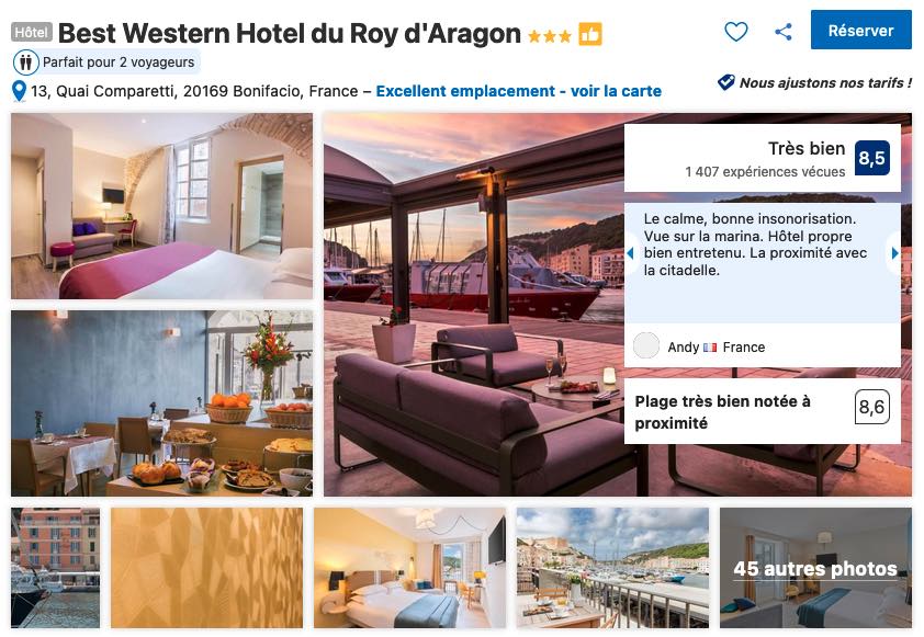 À une centaine de mètres de là, plus en amont sur l’entrée du port, c’est au Best Western Hôtel du Roy d’Aragon que je vous propose de poser vos valises. Attention, les tarifs d’appel de ces chambres ne vous donneront qu’une vue sur la ville ou sur la cour intérieure, comme c’est souvent le cas à Bonifacio ou dans les autres villes emblématiques de Corse, la vue sur mer se monnaie souvent à prix d’or.