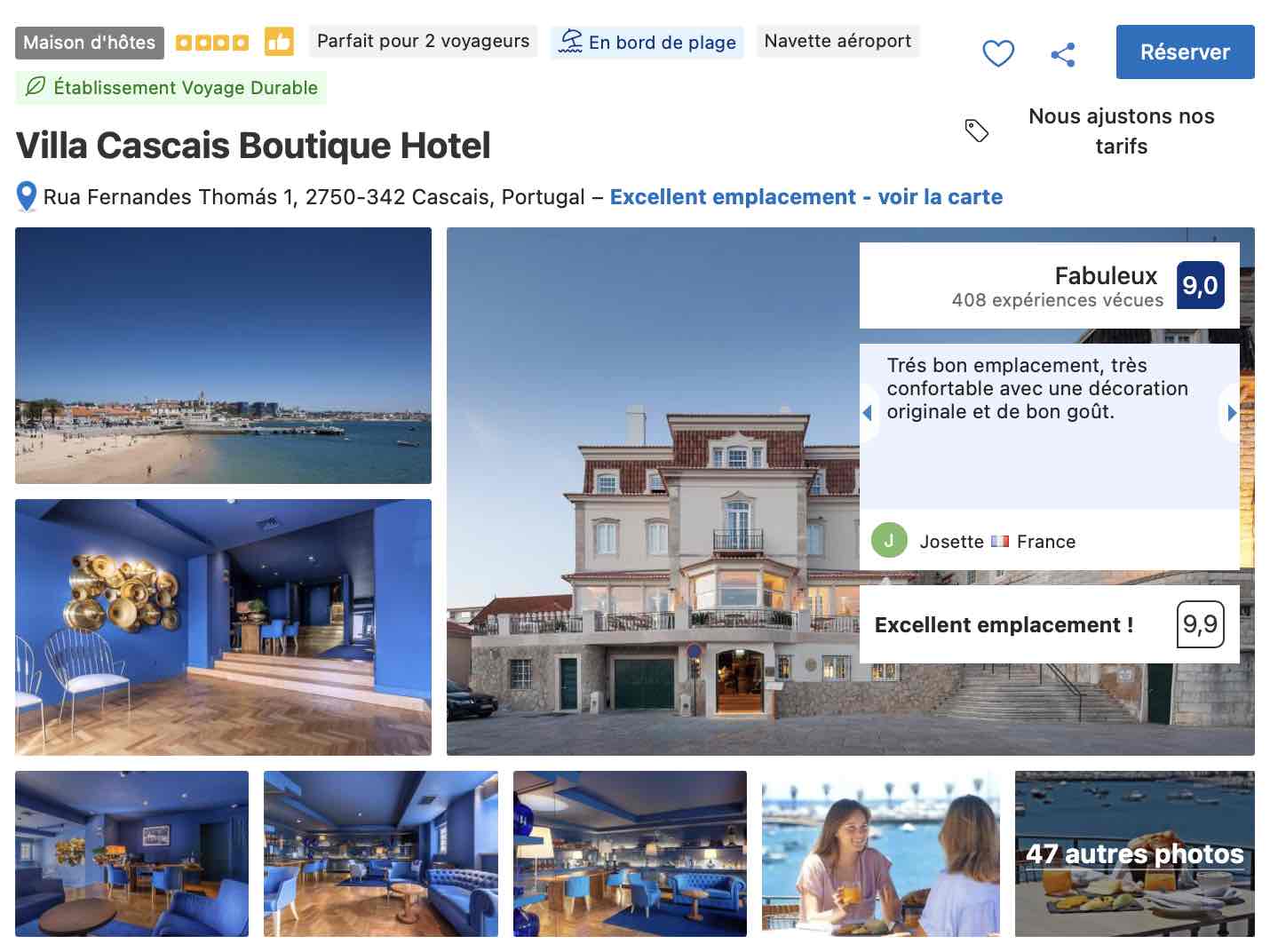 Enfin, pour une nuit ou pour vraiment vous faire plaisir, je vous conseille de réserver votre séjour auprès du Boutique Hôtel Villa Cascais implanté dans une ancienne résidence aristocratique entièrement rénovée. Confort, vue, services, qualité des prestations et bienveillance du personnel, tout semble réuni pour vivre un excellent moment à Cascais si l’on en juge par les commentaires laissés en ligne par les voyageurs avant vous ! L’effort côté budget est récompensé.
