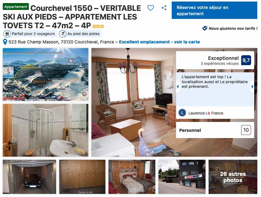 Dans le quartier de Courchevel 1550, vous avez dans ce thème et dans une catégorie de tarif un peu plus haute, cet Appartement 1550 pour 6 personnes qui peut être un bon plan si vous voyagez à plusieurs pour faire des économies sur vos frais de couchage.