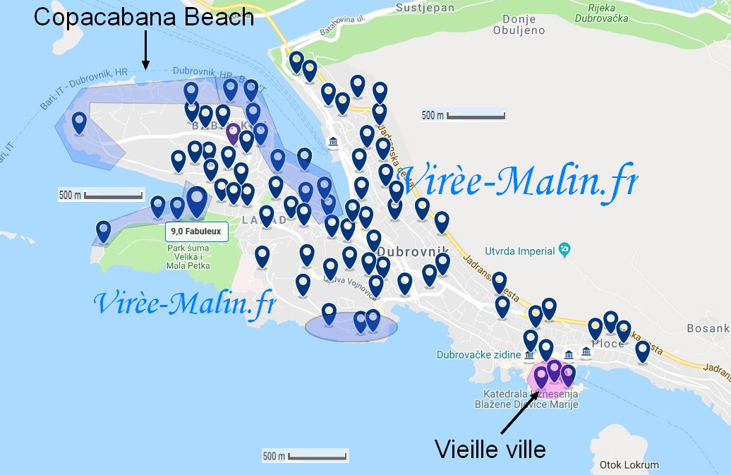 Pour ceux qui me font déjà confiance je ne vous conseille pas de loger dans le centre de Dubrovnik (zone délimitée en rouge sur la carte ci-dessous) car très très touristique !! Pour ma part j’ai logé à l’appartement Iveta, qui se trouve à deux pas de la vieille ville sans la frénésie qui y règne. Quoiqu’il en soit si vous devez cherchez un logement je vous conseille de jetez un oeil dans la zone violette :