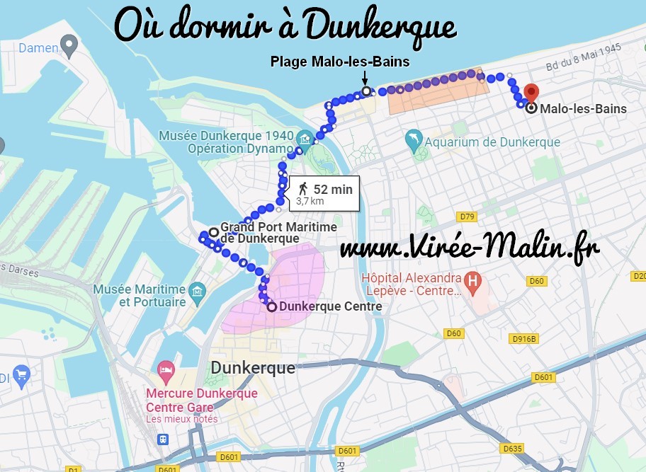Pour ceux qui me font déjà confiance, 2 choix s’offrent à vous pour trouver un hôtel à Dunkerque. Soit vous optez pour un logement dans le quartier de Malo-les-Bains (en orange ci-dessous) soit vous optez pour un logement dans le centre-ville de Dunkerque (en violet). Si vous préférez être proche des sites incontournables à visiter alors optez pour le centre ville (zone violette), si vous préférez le front de mer (optez pour la zone orange) par contre il vous faudra marcher en moyenne 30 minutes pour être dans le centre ville (ou 6 minutes en voiture).