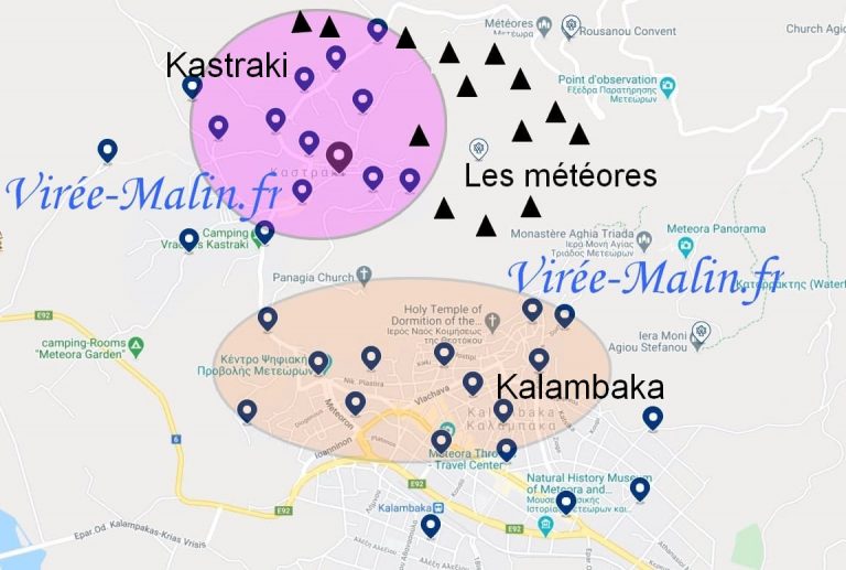 Pour loger aux Météores le mieux c’est de loger dans le village de Kastraki (la zone violette), et si tout est pris (ça part très vite), cherchez dans la zone orange, à Kalambaka.