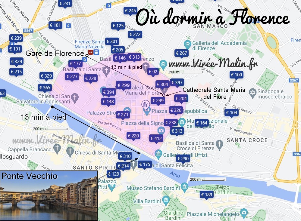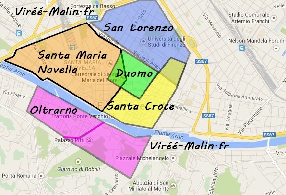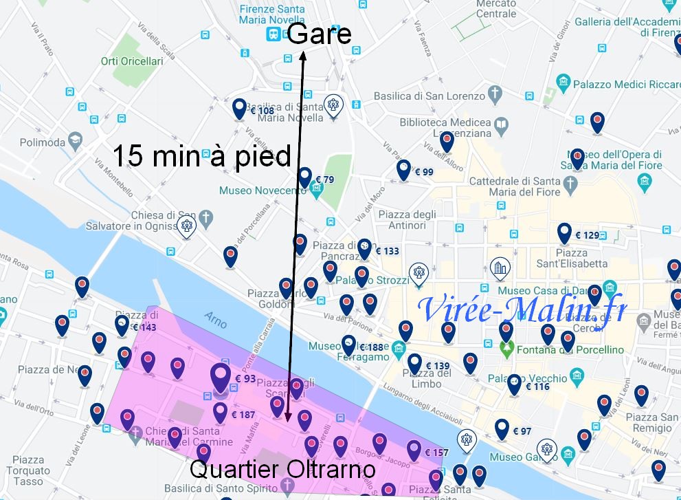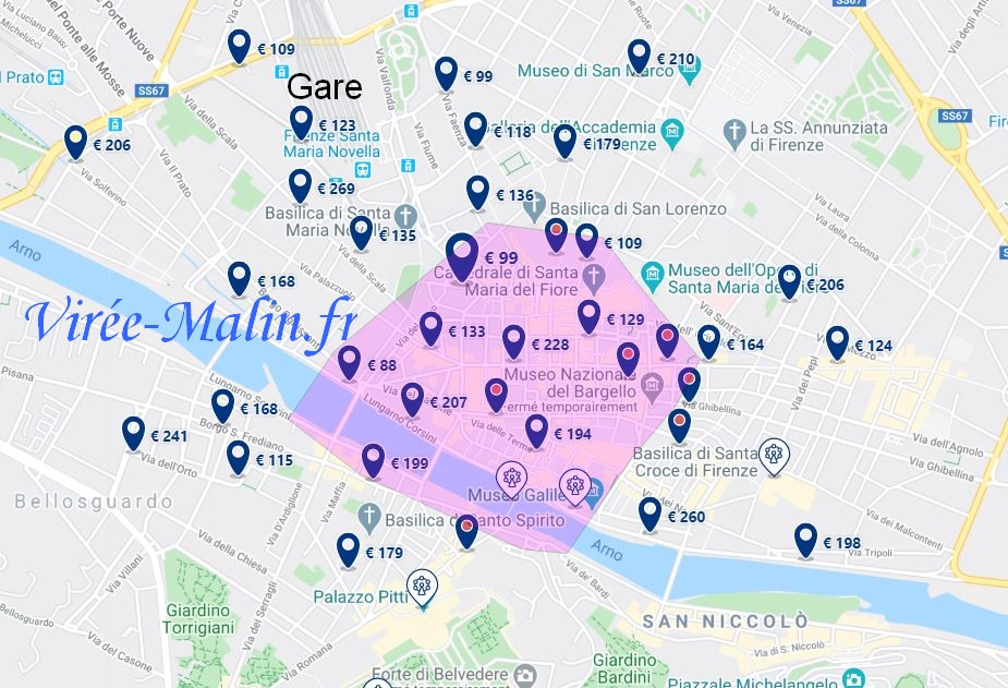 Bref je vous conseille grandement de loger dans les zone oranges et Vertes pour être bien placé à Florence ! Plus exactement dans la zone violette ci-dessous.