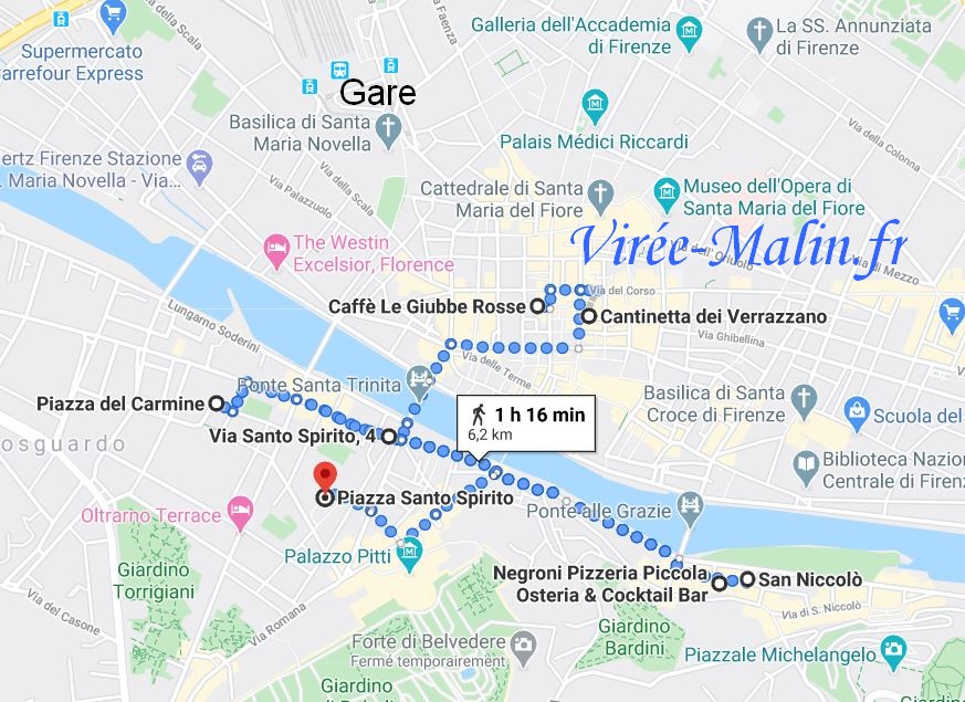 Comme à mon habitude, j’aime utiliser des cartes Google pour vous montrer où se trouve telle ou telle site incontournable à visiter lors de votre séjour. Cela vous permet de voir très rapidement comment s’organise la ville et vous permet donc de comprendre pourquoi il faut loger dans tel quartier de Florence plutôt qu’un autre.
