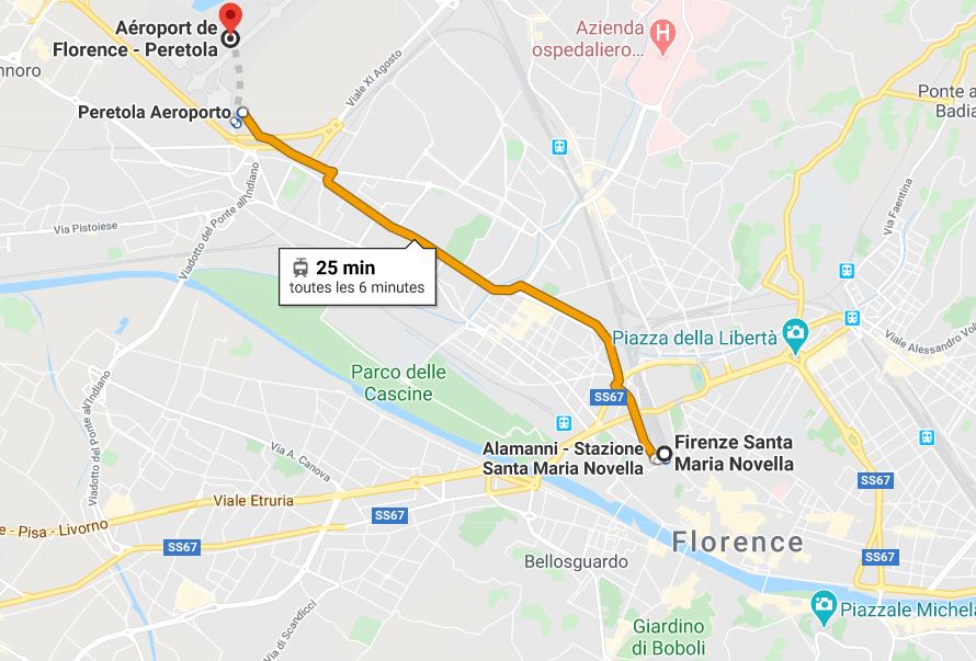 - Cliquez ici pour agrandir cette GoogleMap – Rejoindre votre hôtel depuis l’aéroport de Florence Peretola :