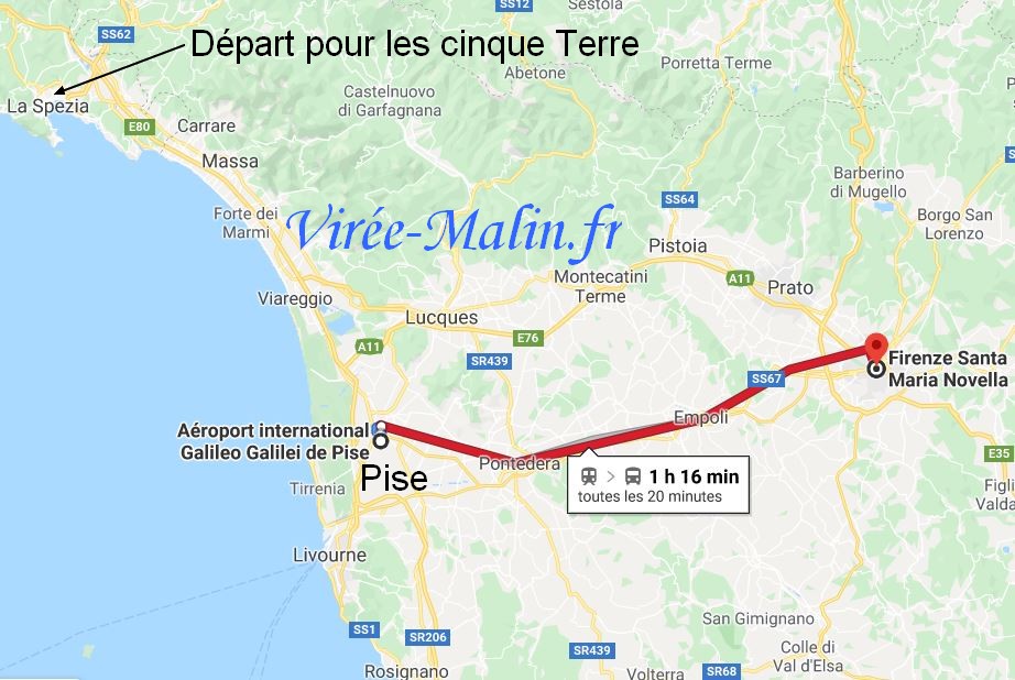 - Cliquez ici pour agrandir cette GoogleMap – Rejoindre votre hôtel à Florence depuis l’aéroport de Pise :