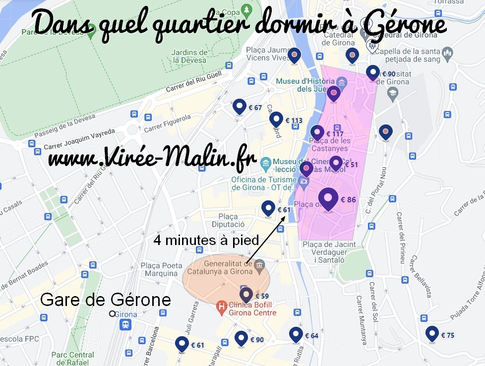 Pour faire simple, idéalement, c’est dans la zone violette que je vous conseille de trouver un logement à Gérone, vous serez idéalement placé pour sortir le soir à pied et visiter la journée. La zone orange est aussi bien situé pour trouver des logements pas cher à Gérone.