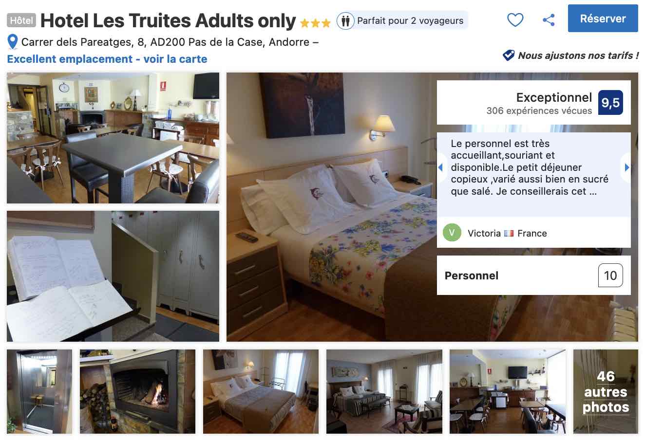 Autre hôtel qui simplifie votre séjour à la montagne au Grandvalira : Les Truites. Particularité de cet établissement : il ne propose que des chambres pour une ou deux personnes, ce qui disqualifie directement les familles. Les remontées mécaniques se trouvent dans un rayon de 250 à 300 mètres de l’entrée et vous vous trouvez à proximité des nombreux restaurants, bars et discothèques qui jonchent le centre du Pas de la Case.