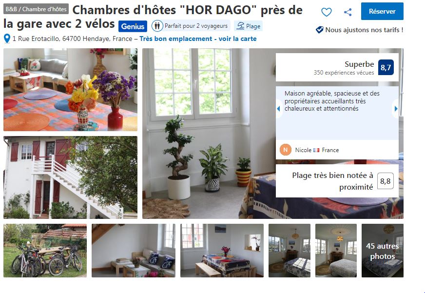 Pour finir, je vous conseille les Chambres d’hôtes « Hor Dago ». Il s’agit ici d’un Bed & Breakfast, que j’aime pour son look simpliste et rustique. On a l’impression de dormir dans une vraie maison basque, avec des parties communes. Même s’il s’agit d’un logement peu excessif à Hendaye, les lieux sont extrêmement propres et le jardin est à la fois charmant et bucolique. Tout ce que j’aime en voyage, de la simplicité et de l’authentique.