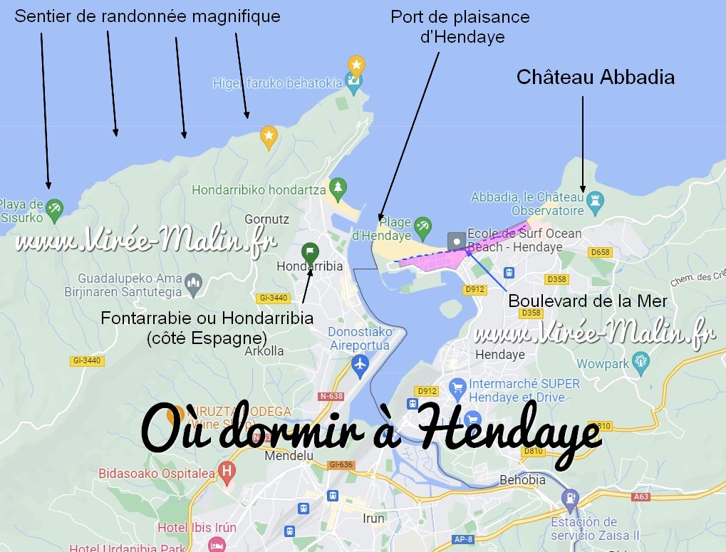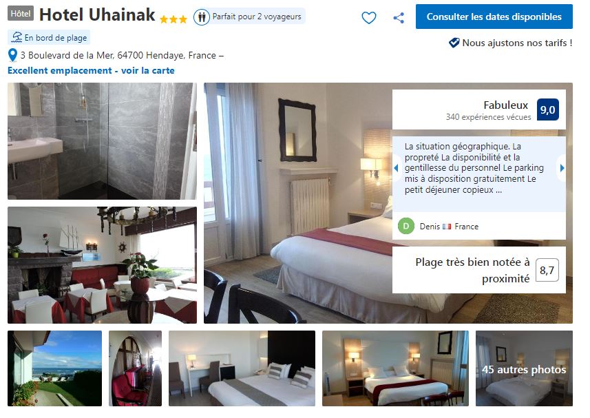 Pour ceux qui me font déjà confiance, si vous voulez loger à Hendaye, trouvez un hôtel le long du boulevard de la mer, vous serez idéalement placé pour profiter de toutes les infrastructures que propose la ville. L’Hôtel Uhainak est idéalement placé avec des chambres vue mer mais attention il y a très peu d’hôtel sur ce boulevard. Par contre il y a de nombreux appartement à louer.