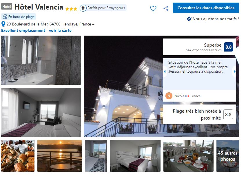 Le second hôtel que je vous conseille Boulevard de la mer à Hendaye est l’Hôtel Valencia.