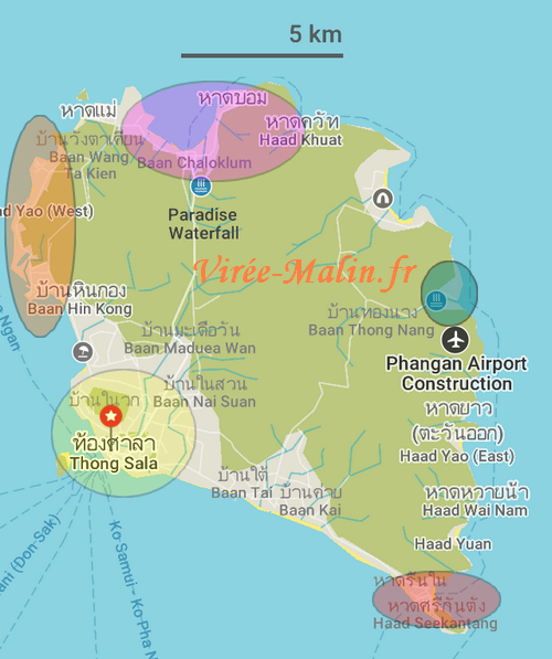 Si vous souhaitez profiter de la full moon party de Koh Phangan, et que vous souhaitez donc dormir à côté de la full moon party de Ko Phangan, je vous conseille donc de vous loger dans la partie verte ou orange (voir la carte ci-dessous). La partie rouge est bien aussi mais c’est un peu loin, comptez 15 minutes de marche depuis la plage de Haad Rin (la plage de la full moon party, dans la zone verte ci-dessous).