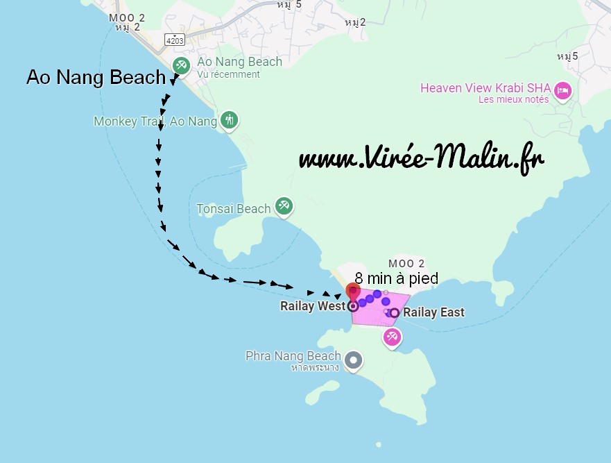 A Railay Beach vous avez des logements à l’Est et à l’Ouest, mais peu importe où vous logez car en 8 minutes vous passez d’un côté à l’autre… Dans mon article « que faire à Krabi » je vous dis que faire à Railay Beach.