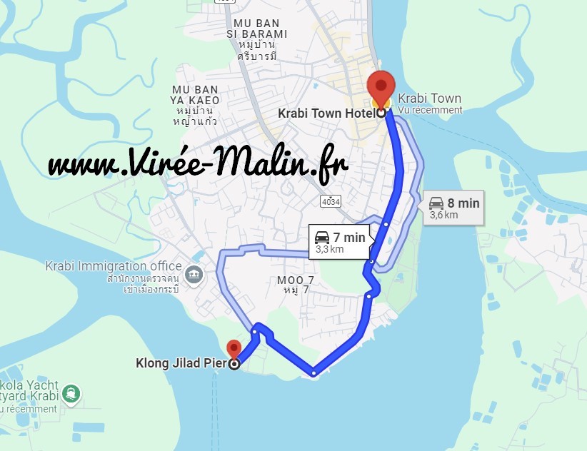 Pour prendre le bateau le lendemain, demandez à votre hôtel (dés votre arrivée à l’hôtel) de vous réserver le bateau et de faire venir quelqu’un pour vous y amener. L'embarcadère « Klong Jilad Pier » se trouve à 8 minutes en voiture de Krabi Town.