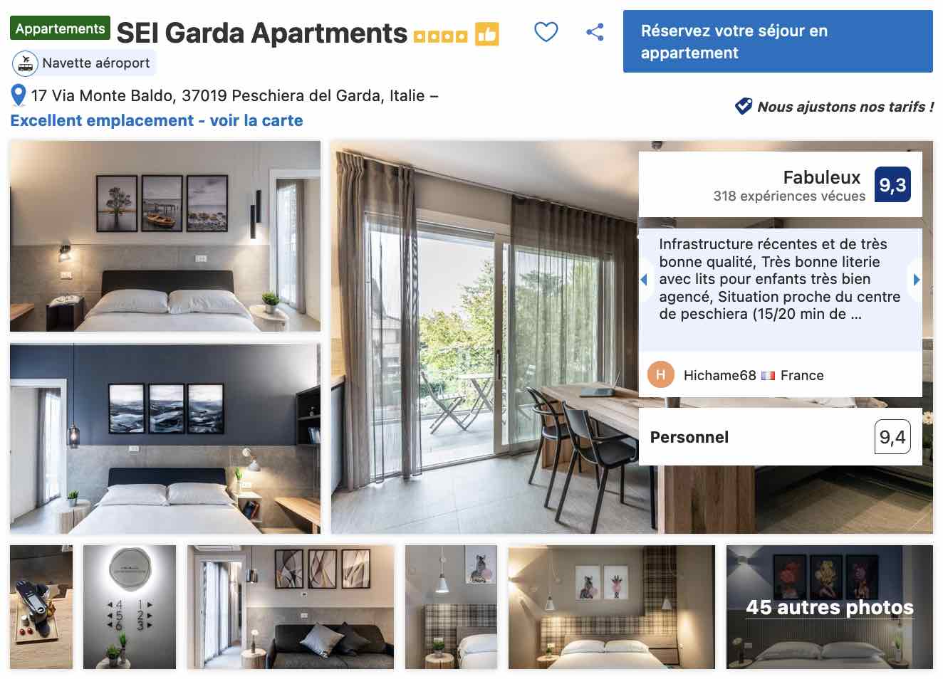 Les tarifs proposés par les hôtels ont tendance à être relativement élevés, si bien que je vous recommande de vous éloigner légèrement du front de mer pour votre première nuit au lac de Garde. En louant une chambre au SEI Garda Apartements, vous n’êtes situé qu’à un petit kilomètre du centre-ville. Un trajet largement faisable à pied ! En plus, vous profitez du parking de l’établissement, le tout pour environ 80 euros la nuit.