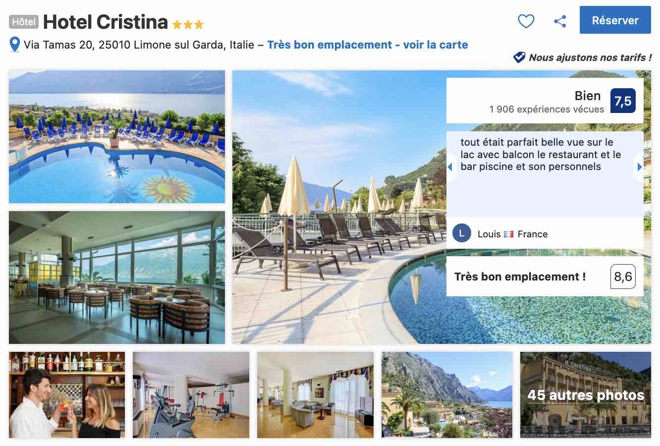 Je vous invite à dormir à Limone Sul Garda dans l’hôtel Cristina, une très belle adresse qui bénéficie d’une vue splendide sur le lac, le port et les collines environnantes tout en vous proposant une place de parking gratuite.
