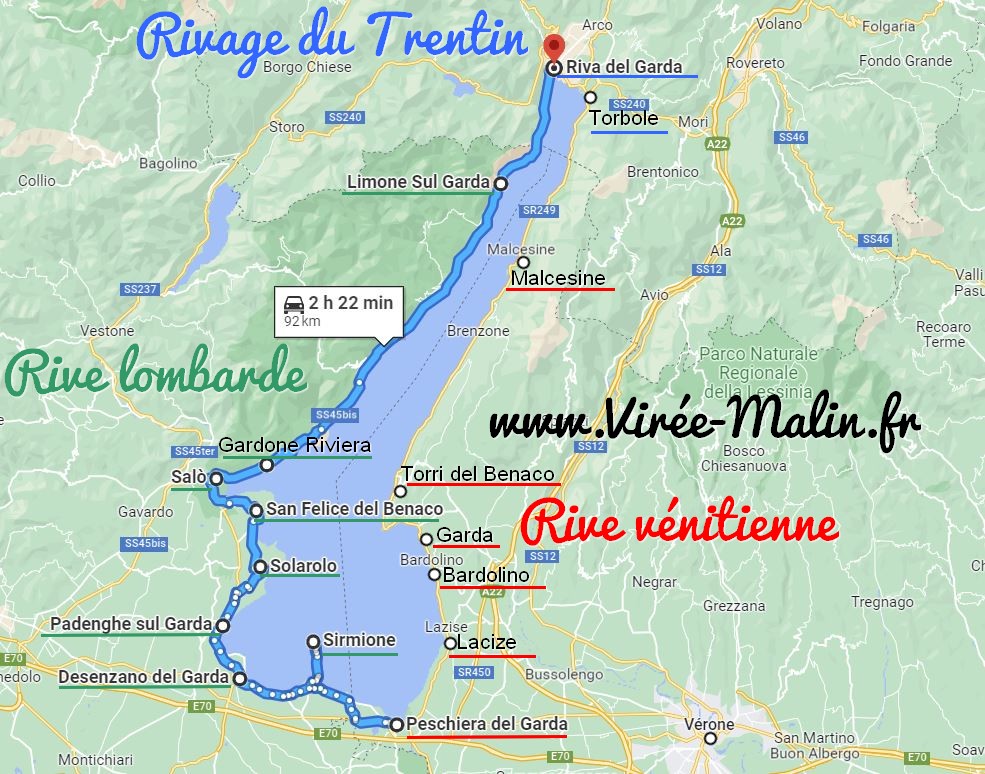 Le Lac de Garde c’est aussi 3 régions, la région lombarde en vert (plus accès aux familles avec des parcs d’attraction comme Movieland, Gardaland et Caneva World), la région région du Trentin en bleu (pour les sportifs: rando, sport nautique, la voile, l’escalade), et la région Vénitienne en rouge (Garde en est sa carte postale, un village authentique avec de belles ballades au bord du lac, restaurants, bars, panoramas magnifiques…). Lien GoogleMap