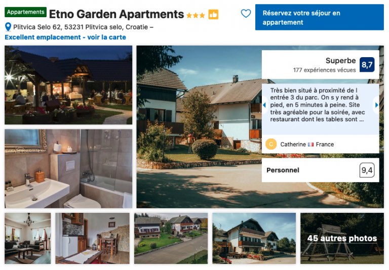 Pour un ultime recours en cas d’affluence et pour un hébergement de qualité près de l’entrée P3 du parc des lacs de Plitvice, je vous recommande également l’Etno Garden Apartments. C’est une solution de logement qui peut s’avérer idéale pour des séjours en famille grâce à la possibilité de réserver des appartements jusqu’à quatre personnes avec tout le confort moderne.