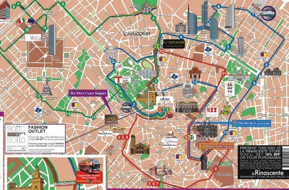 /!\ Le bus touristique de Milan a un itinéraire qui passe devant tous les sites incontournables de Milan comme la Galerie Vittorio Emmanuel II (le Duomo est juste derrière comme vous l’avez vu dans la vidéo précédente), le musée de Léonard de Vinci qui est juste à la sortie de cette même galerie, il passe à côté de La Cène de Léonard de Vinci qui se trouve à la Pinacothèque de Brera, puis va aussi jusqu’au château de Sferza. Vous pouvez vous arrêter quand vous voulez et monter quand vous le souhaitez. Cliquez ici pour plus d’infos.