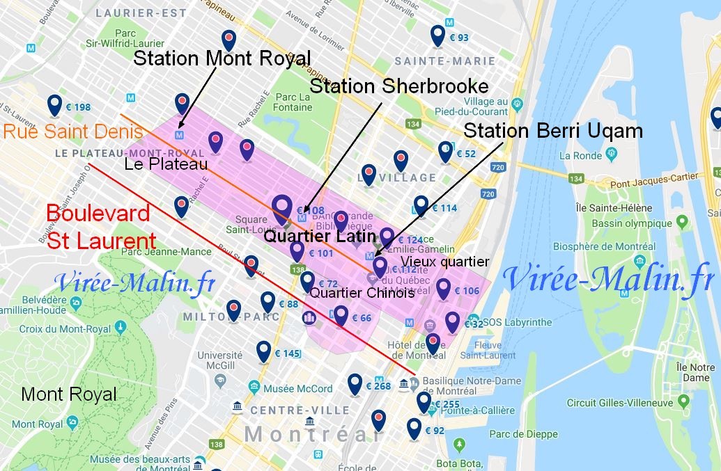 Le quartier Latin, le plateau sont traversés par la rue Saint Denis, voilà pourquoi je vous conseille de loger proche des 3 stations Mont Royal, Sherbrooke ou Berri. Vous serez ainsi proche des endroits pour sortir et vous pourrez pas vous perdre, puisque la rue Saint Denis traverse ces quartiers.