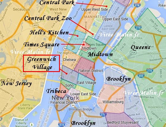 Le quartier Greenwich Village est un quartier vraiment très sympa pour se loger à New York. Comme vous pouvez le voir sur le plan ci-dessous, il est idéalement bien placé, ce qui vous permet de vous permet d’être à deux pas des sites à visiter à New York.