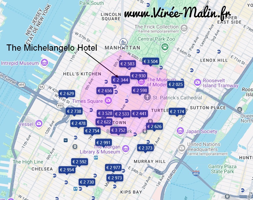 Pour ma part j’ai logé au Michelangelo (pendant le mois de Mai et j’ai payé 2095€ pour 8 nuits ce qui fait 260€/nuit) qui se trouve en plein Times Square et à 5 minutes à pied de Central Park (voir la carte ci-dessous du prix des hôtels pour 1 semaine avec 8 nuits dans le centre de Manhattan).