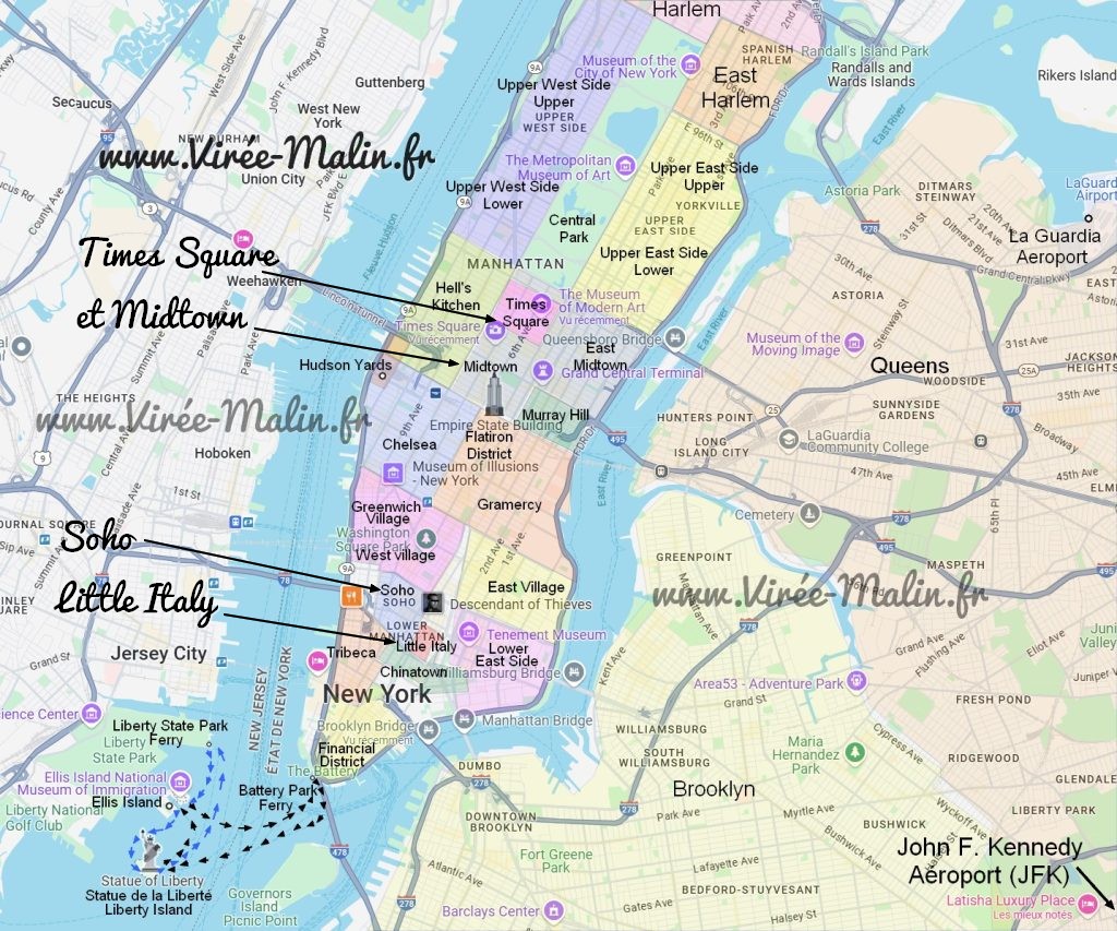 Voilà une nouvelle carte que j’ai personnalisé pour vous pour que vous puissiez vous familiariser avec tous les « petits » quartiers de Manhattan et pour information, pour faire Central Park à Soho à pied il faut 1h15 de marche ou 20 minutes de métro (et oui c’est grand!).