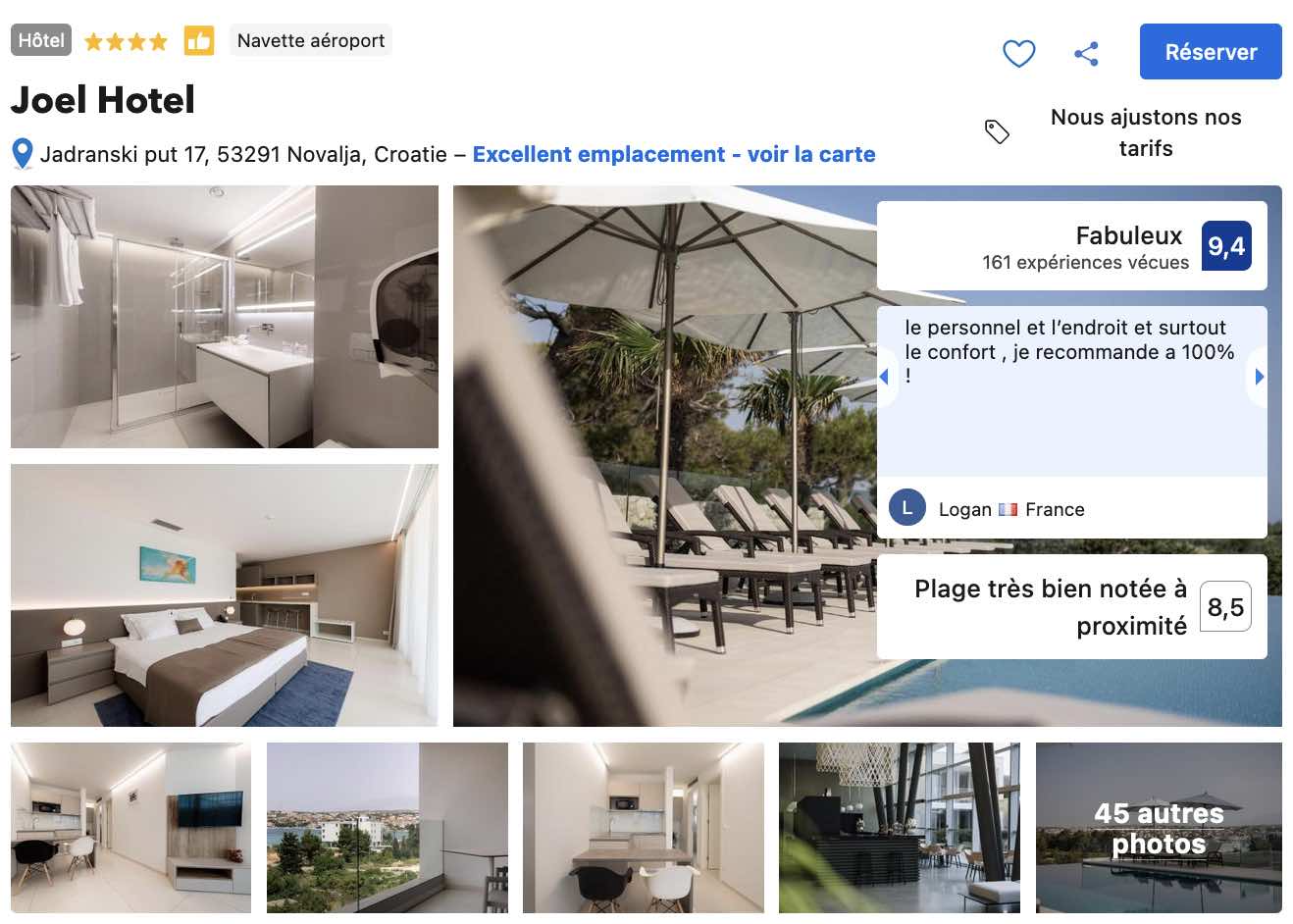 Enfin, un peu plus cher, mais pour des prestations largement supérieures, vous trouvez également le Joel Hotel, un établissement légèrement excentré du centre de la ville, mais à faible distance des points de départs des navettes qui vous relie à la plage de Zrce. Certaines chambres offrent une magnifique vue sur la mer, vous trouvez sur place une grande piscine extérieure, un restaurant de spécialités et un bar.