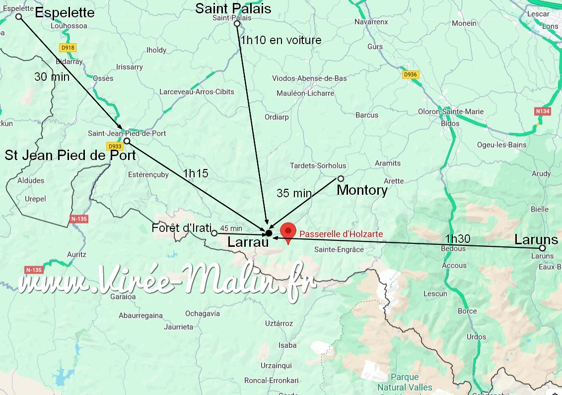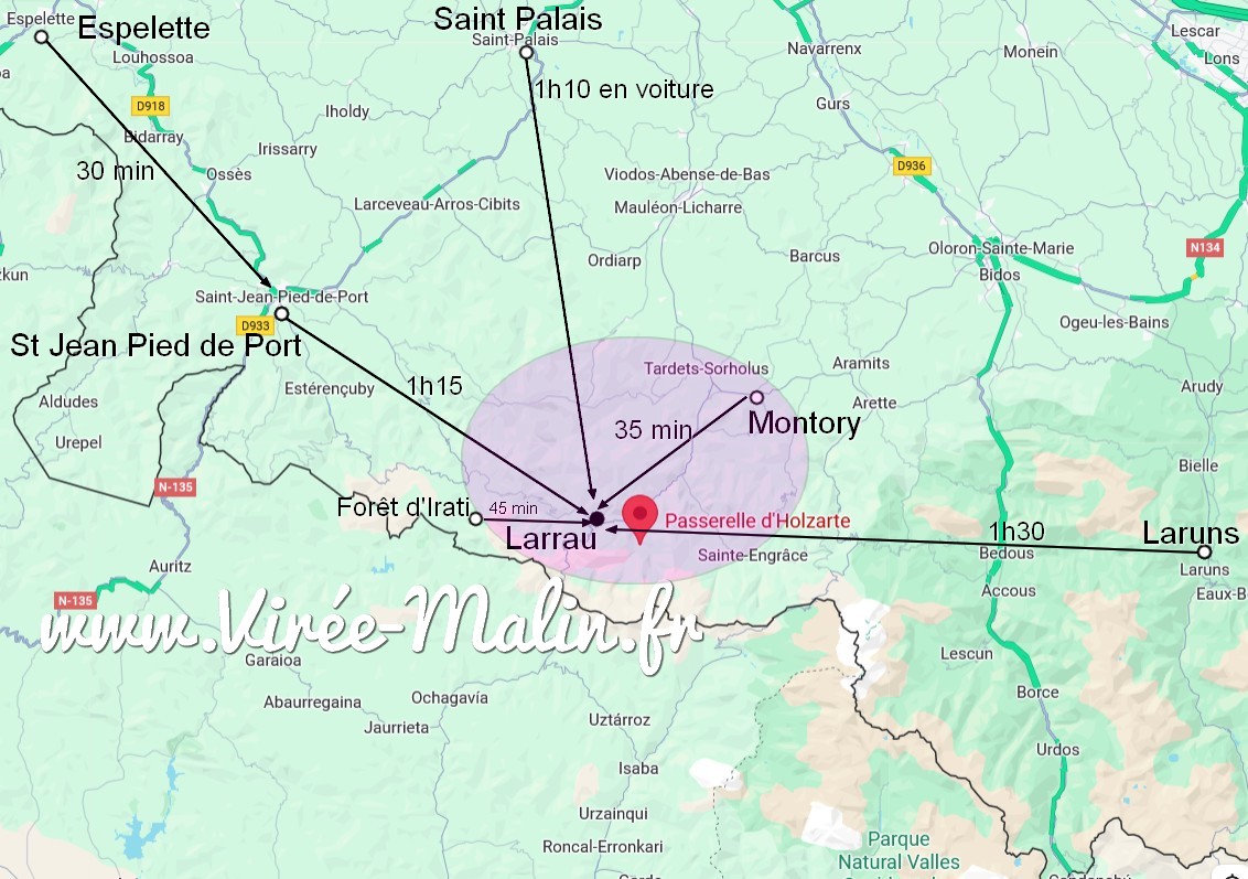 Comme dans mes habitudes, voilà une carte que j’ai personnalisée et qui vous permet de voir les temps de trajet en voiture pour rejoindre la passerelle d’Holzarte. Comme vous pouvez le voir, il n’y a plus de grand axe autoroutier, donc faites attentions au temps de trajet…