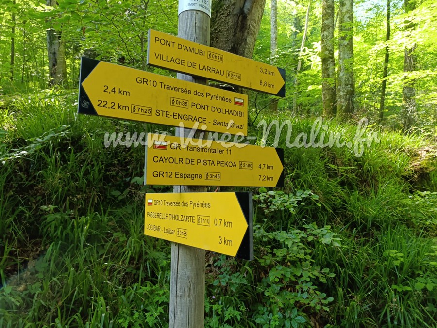Après avoir traversé la passerelle d’Holzarte, le chemin de randonnée continu et vous allez arriver à ces panneaux. Je vous conseille de prendre à gauche en direction du Pont d’Olhadibi, idéal pour pique-niquer.