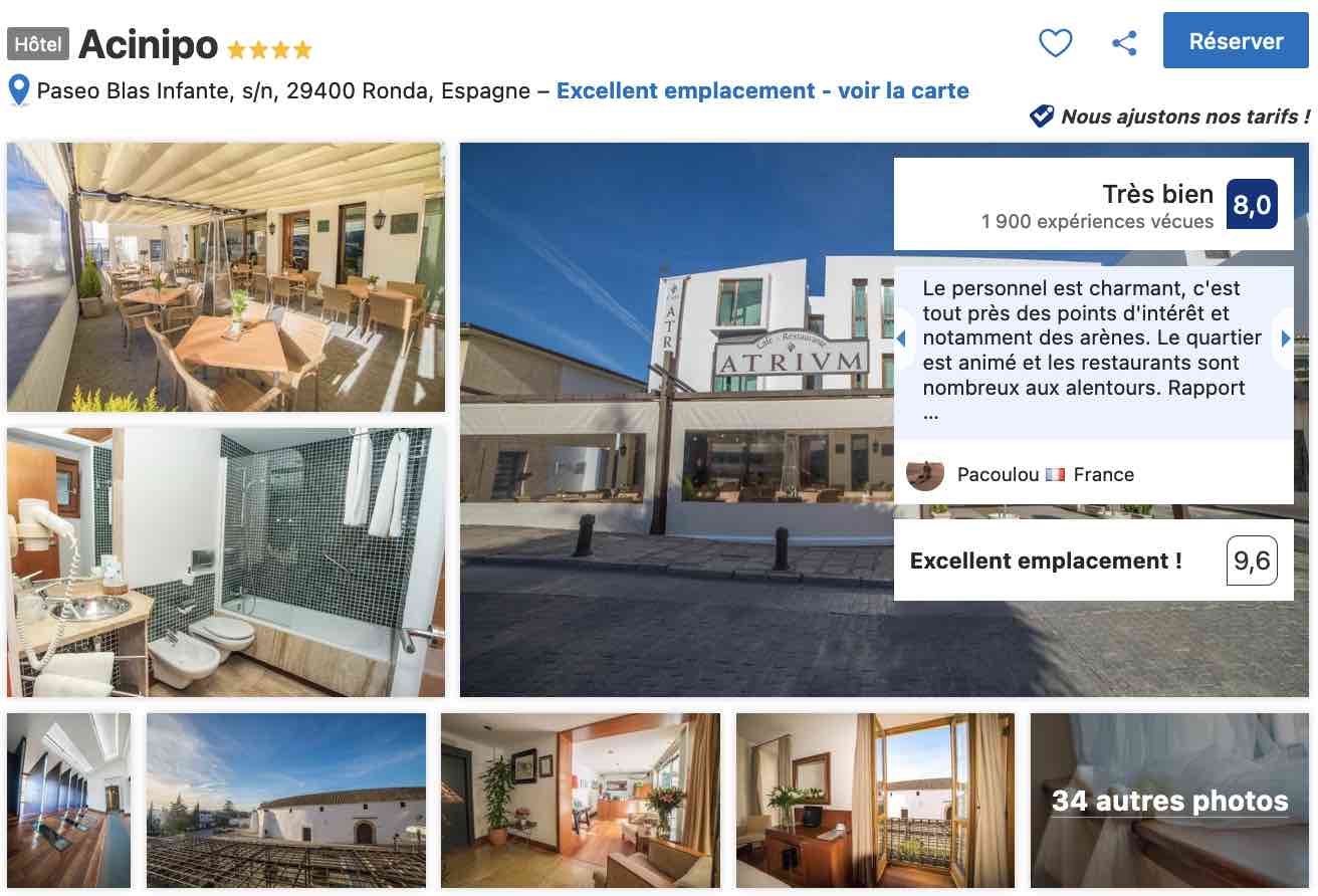 Première adresse que je vous recommande pour dormir à Ronda : l’Hôtel Acinipo qui se situe sur la Plaza de Toros, à deux pas du pont surplombant le Tage. Pour moins de 70 euros la nuit avec les petits déjeuners compris, vous profitez d’un emplacement idéal et de prestations dignes du confort quatre étoiles annoncé par l’établissement. Moyennant un supplément, l’hôtel propose une place de stationnement sur son parking.