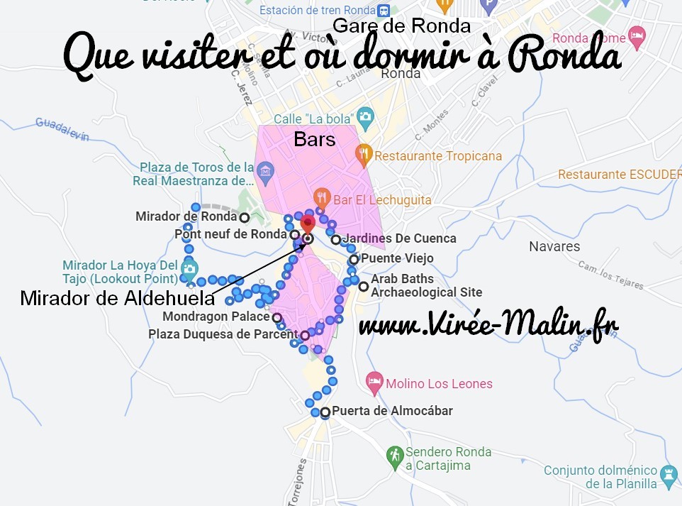 Pour ceux qui me font déjà confiance, c’est dans la zone violette que je vous conseille de trouver votre logement à Ronda, vous serez idéalement placé pour visiter les incontournables, mais aussi pour pouvoir sortir le soir à pied. 2 nuits maximum suffit à Ronda, ça reste une petite ville.