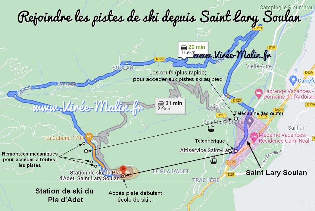 La station de ski de Saint Lary s’appelle le Pla d’Adet et pour rejoindre le Pla d’Adet depuis Saint Lary vous avez soit le choix de prendre la voiture soit de prendre la télécabine. A savoir que le soir c’est plus sympa de loger dans le village de Saint Lary Soulan car au Pla d’Adet il n’y a pas grand chose.