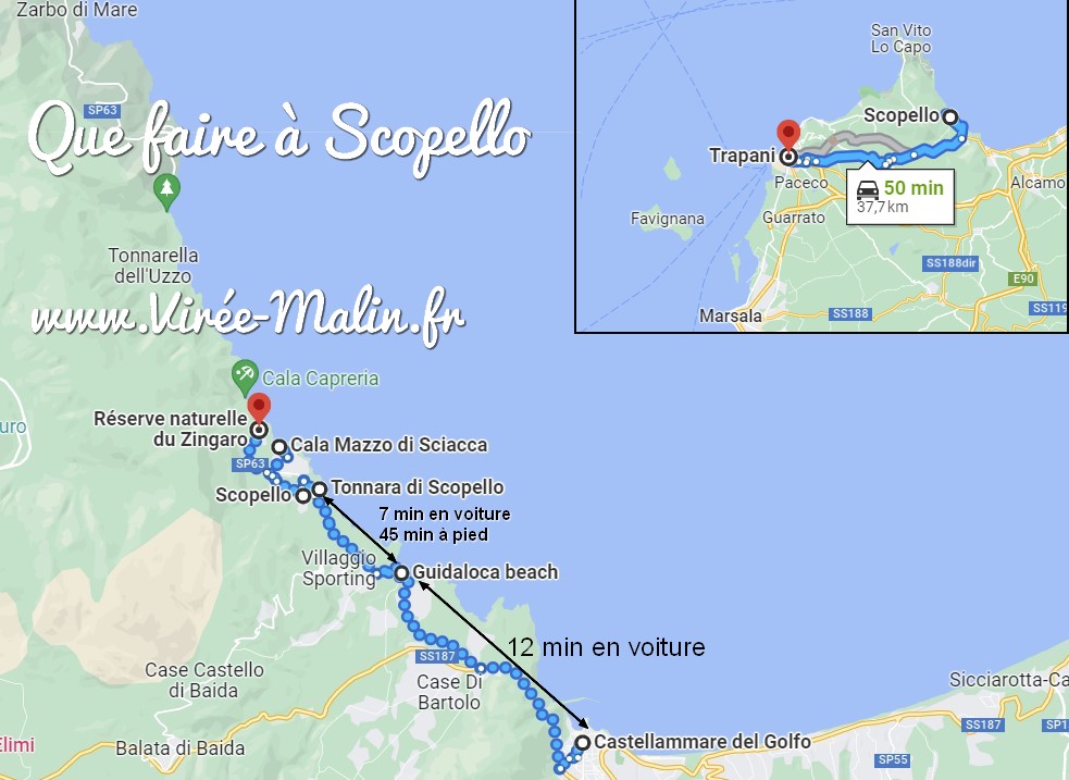 Il serait dommage de ne pas visiter les alentours, la région est vraiment magnifique et rien que pour la visiter je vous conseille de rester 4 voir 5 jours dans cette région. L’idéal serait de passer 1 nuit à Scopello, 2 nuits à Trapani et 1 nuit à Favignana!