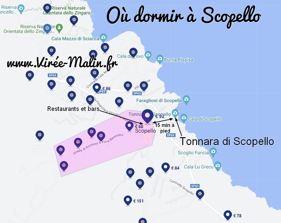 Je vous conseille de trouver un logement dans la zone violette qui représente le petit bourg vivant de Scopello.